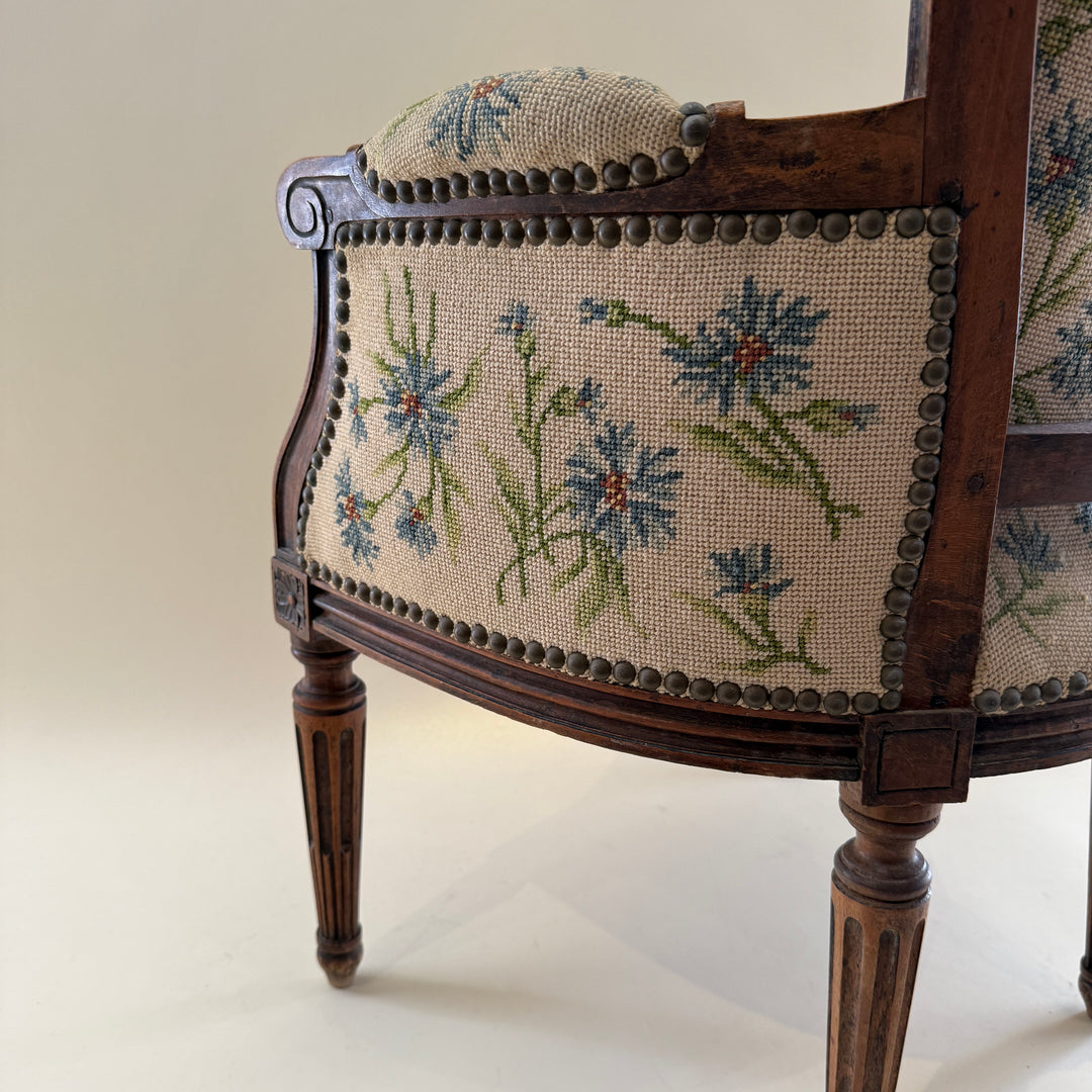 Vintage Miniature French Curved-Back Chair with Loose Cushion in a Charming Needlepoint Pattern. Underneath the cushion: For Delia Duke Born January 30, 1948 From Grandmother Ordway 1959.