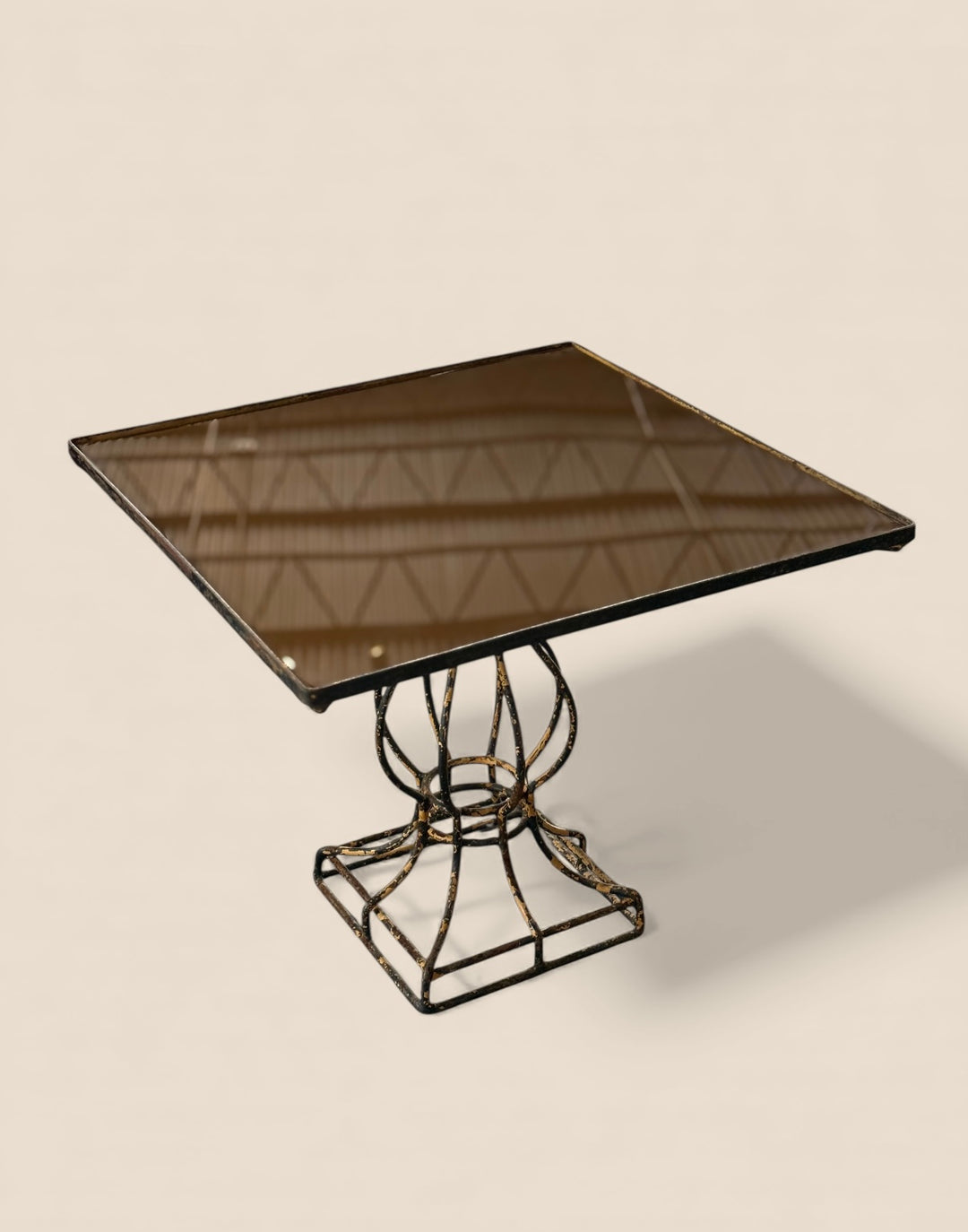 Wrought iron side table showcasing a newly fitted reverse-painted glass top, combining refined materials with an elegant design.