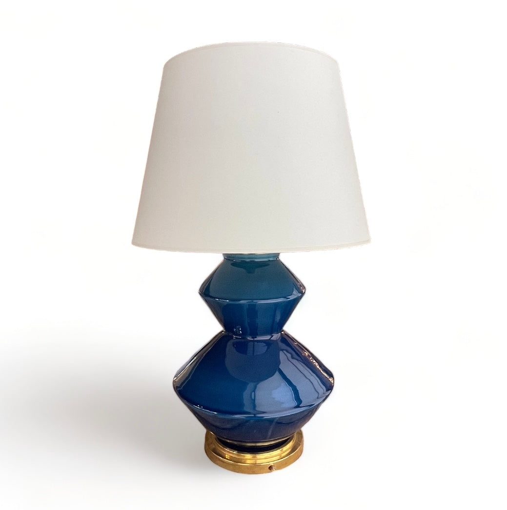 Wide Zig Zag, Prussian Blue, 23k Gold Water Gilt Base, Brass Double Socket Cluster, Vellum Paper Shade.